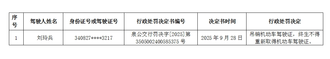 根据《中华人民共和国道路交通安全法》第一百零一条规定,依法给予下列机动车驾驶人吊销机动车驾驶证的行政处罚决定。因邮寄送达被退回,决定书无法送达至当事人本人。根据《公安机关办理行政案件程序规定》第三十六条第四款规定,现依法公告送达,自公告发出之日起,经过六十日,即视为送达。如不服本决定,可以在本公告期满之日起60日内向泉州市人民政府申请行政复议;或者在6个月内向人民法院提起行政诉讼。