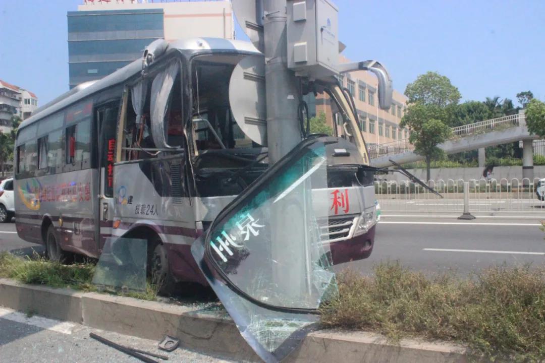 8月26日12时53分,陈某驾驶一部中型客车行驶至坪山路泉州农校路段时,不慎撞上路中标志牌。猛烈的撞击使得车前挡风玻璃全部破碎、车身变形。