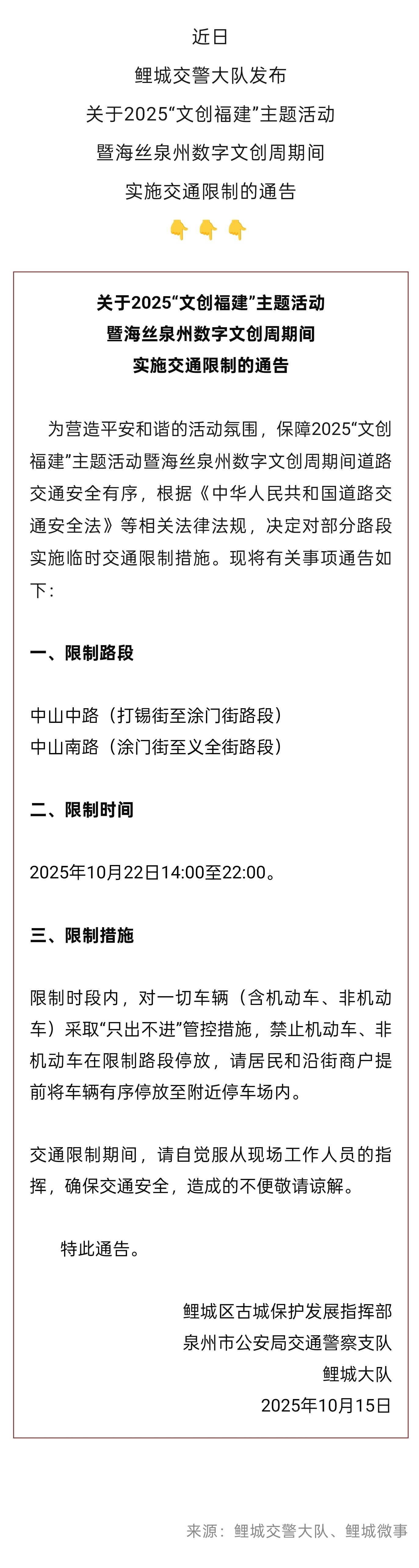 泉州古城部分路段将实施临时交通限制