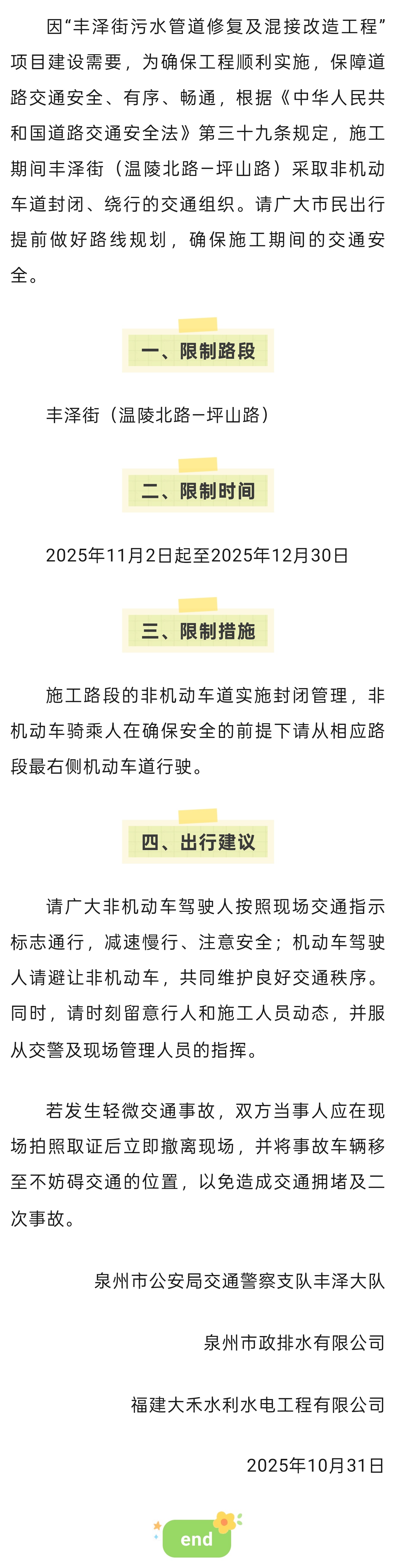 关于丰泽街非机动车道施工期间实施交通限制的通告
