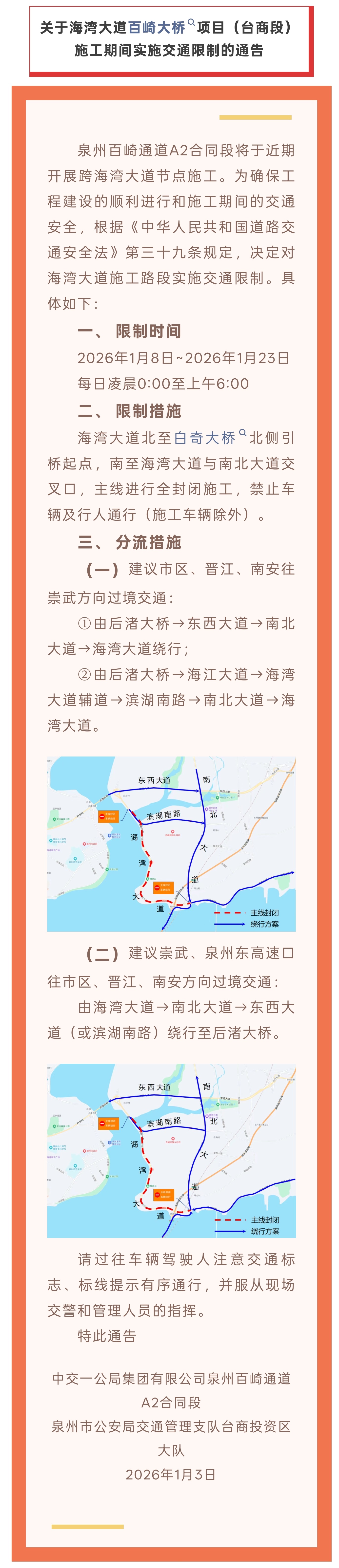 关于海湾大道百崎大桥项目(台商段)施工期间实施交通限制的通告