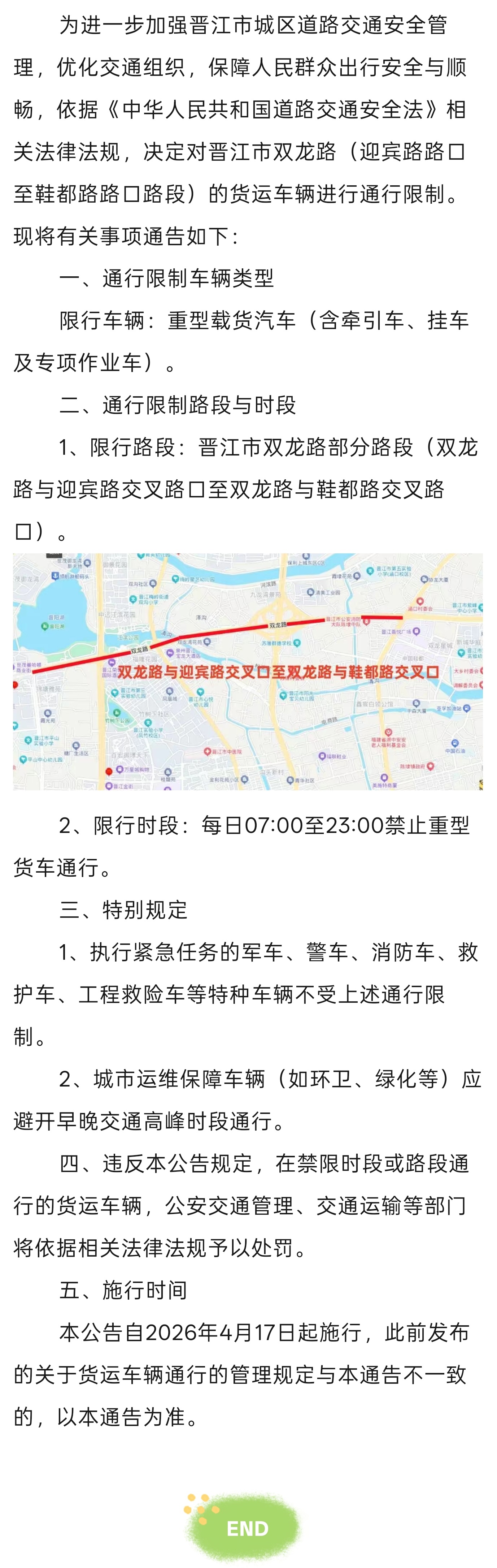 晋江市双龙路(迎宾路路口至鞋都路路口)对重型货车实施通行限制的通告