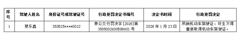 根据《中华人民共和国道路交通安全法》第一百零一条规定,依法给予下列机动车驾驶人吊销机动车驾驶证的行政处罚决定。因邮寄送达被退回,决定书无法送达至当事人本人。根据《公安机关办理行政案件程序规定》第三十六条第四款规定,现依法公告送达,自公告发出之日起,经过六十日,即视为送达。如不服本决定,可以在本公告期满之日起60日内向泉州市人民政府申请行政复议;或者在6个月内向人民法院提起行政诉讼。