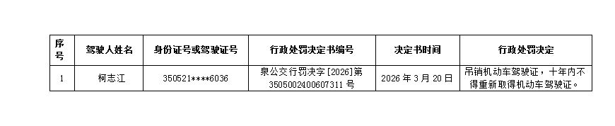 根据《中华人民共和国道路交通安全法》第一百零一条规定,依法给予下列机动车驾驶人吊销机动车驾驶证的行政处罚决定。因邮寄送达被退回,决定书无法送达至当事人本人。根据《公安机关办理行政案件程序规定》第三十六条第四款规定,现依法公告送达,自公告发出之日起,经过六十日,即视为送达。如不服本决定,可以在本公告期满之日起60日内向泉州市人民政府申请行政复议;或者在6个月内向人民法院提起行政诉讼。