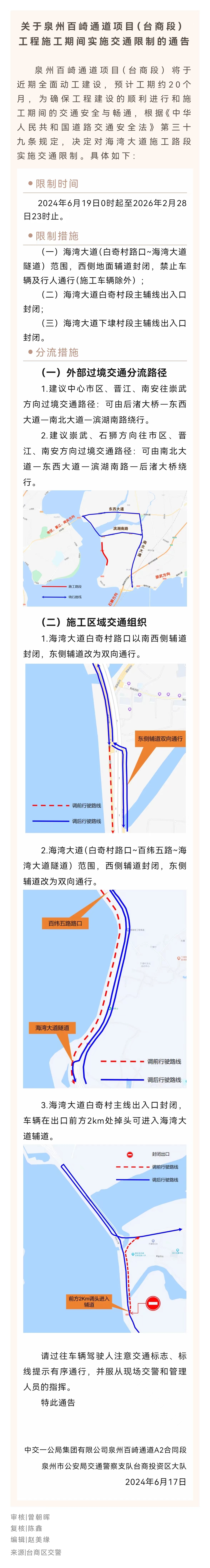 关于泉州百崎通道项目(台商段)工程施工期间实施交通限制的通告
