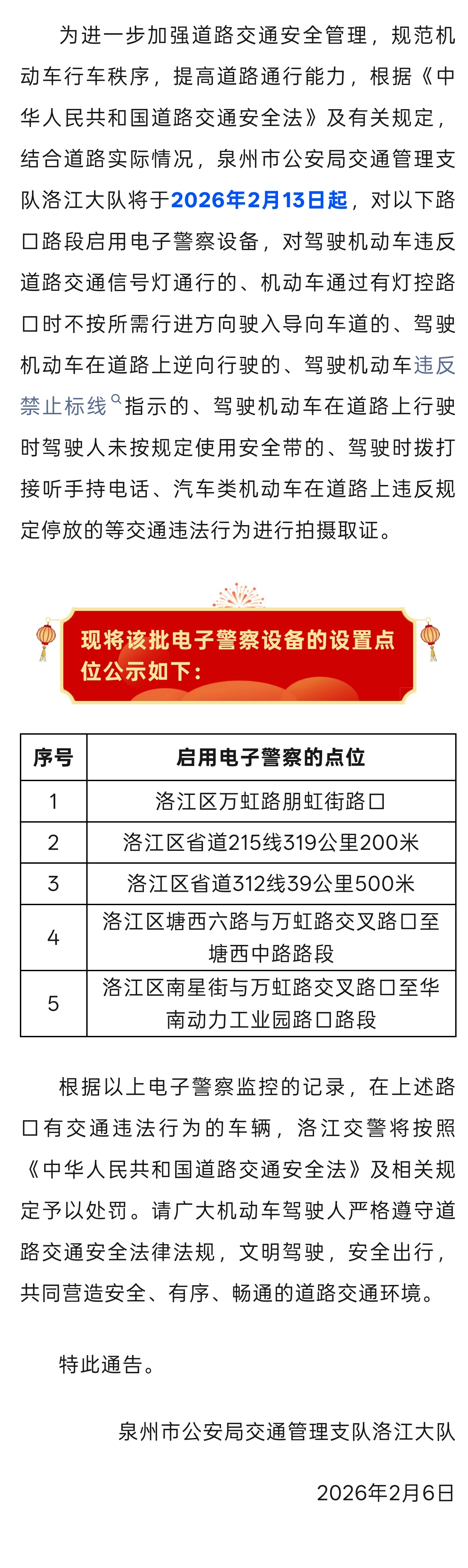 关于泉州市洛江区5个路口启用电子警察抓拍交通违法行为的通告