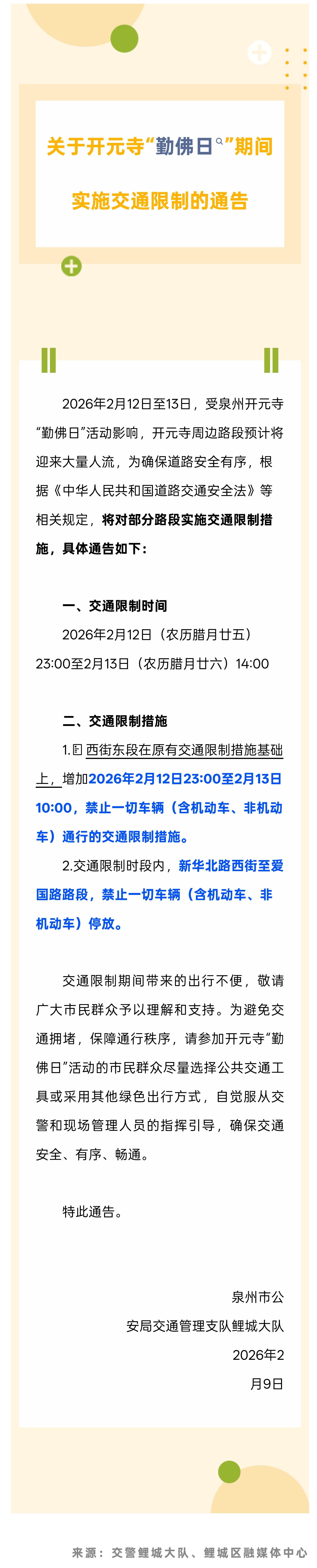 注意!开元寺“勤佛日”期间,鲤城这些路段禁行禁停!